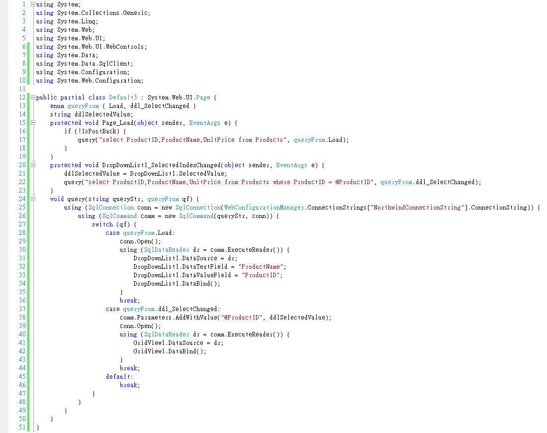 使用控制項資料繫結,只要將查詢完的資料指定給ComboBox 的DataSource 就可以免除寫items.add迴圈